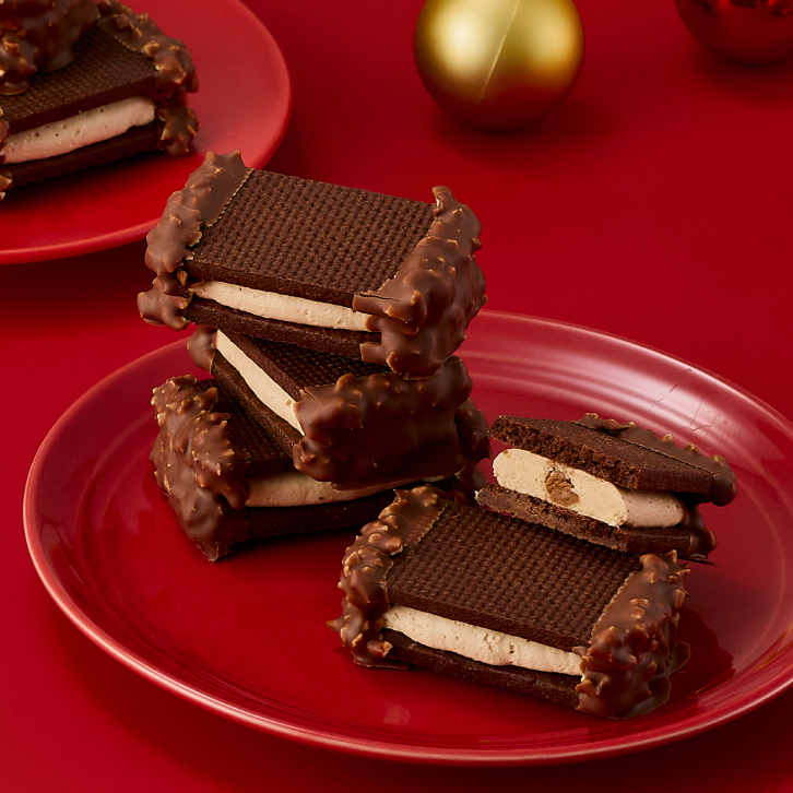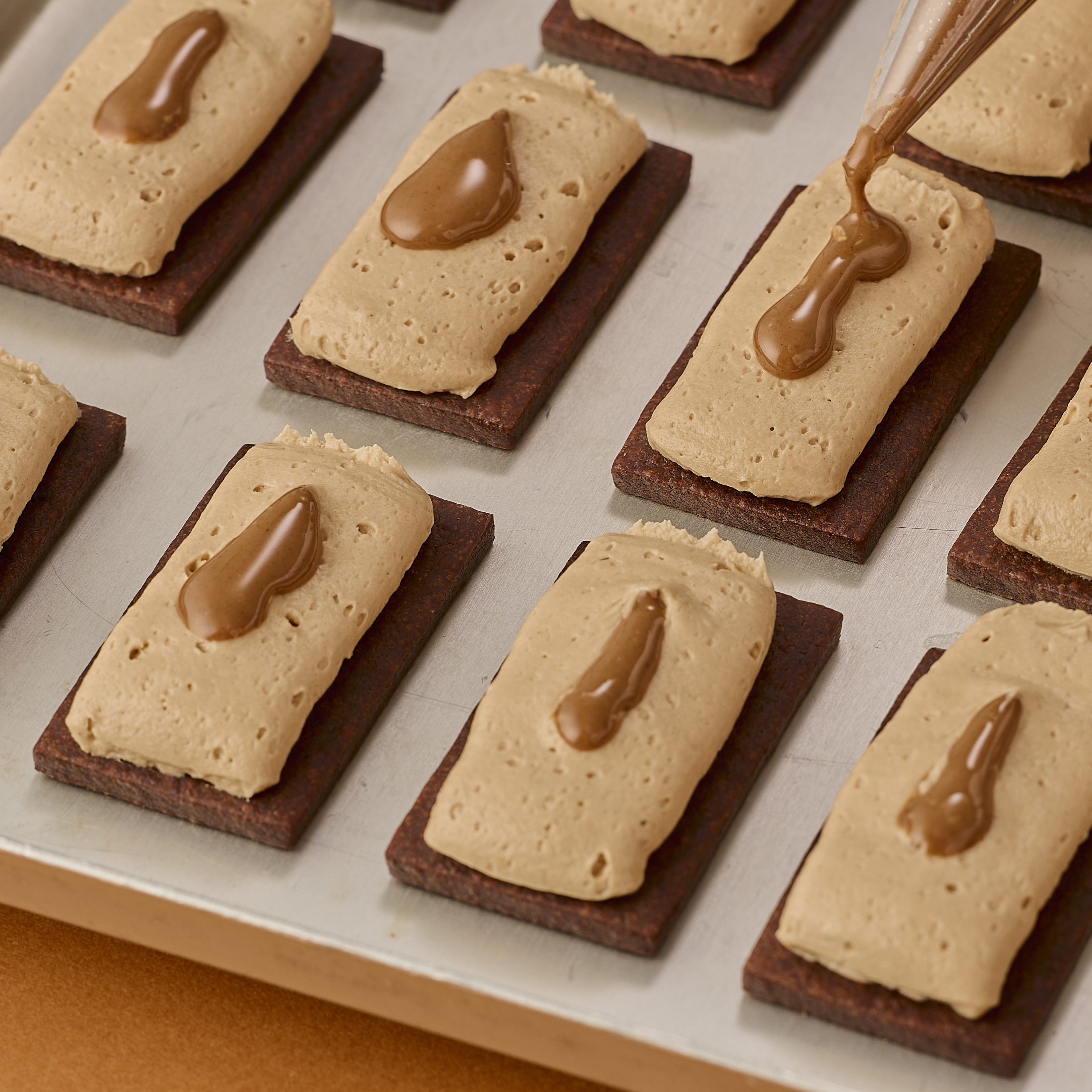 ナッツ風味のバタークリームとナッツのペーストをカカオが香るショコラサブレでサンド。