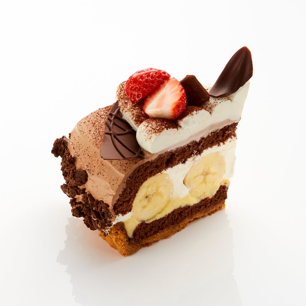 まるごとバナナを生クリームとカスタードクリームで包み、ココアスポンジでサンドして、香ばしいタルト生地にのせました。